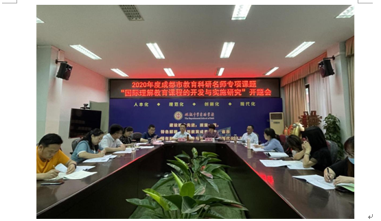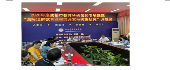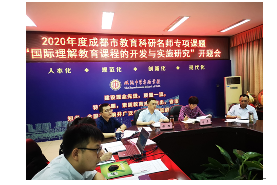 課堂觀摩之后,全體與會(huì)人員移步至學(xué)校第三會(huì)議室繼續(xù)開展課題開題研討活動(dòng)。學(xué)校外事辦副主任李征主持研討活動(dòng)。李主任首先介紹了與會(huì)的專家并歡迎專家們的到來,他結(jié)合當(dāng)天“六一兒童節(jié)”這一話題,勉勵(lì)課題組老師們永葆課題研究的熱情。雙流區(qū)教育科學(xué)研究院教育改革研究中心易恩主任在會(huì)上宣讀了成都市教育科研名師專項(xiàng)課題“國際理解教育課程的開發(fā)與實(shí)施研究”立項(xiàng)通知(課題編號(hào)CY2020ZM40)。隨后,由國際理解課題組做開題報(bào)告。課題負(fù)責(zé)人歐英老師結(jié)合時(shí)代背景,學(xué)校的辦學(xué)目標(biāo)和育人目標(biāo)匯報(bào)了我校國際理解教育課程的問題提出與核心概念的界定,楊四維老師匯報(bào)了課題研究綜述,課題研究意義和課題研究目標(biāo)與內(nèi)容,陳幸老師匯報(bào)了課題研究措施與預(yù)期研究成果和效果。